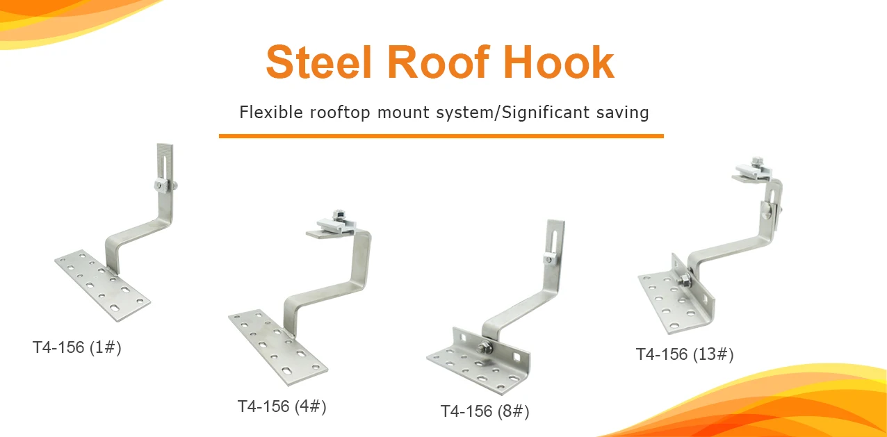 Pitched tile roof hooks are used to support the rail. They have adjustable and fixed type for your choices. Different type roof hook can meet different tile roofs. Varied roof hooks or brackets with tilt-in modules ensure easy and quick installation.